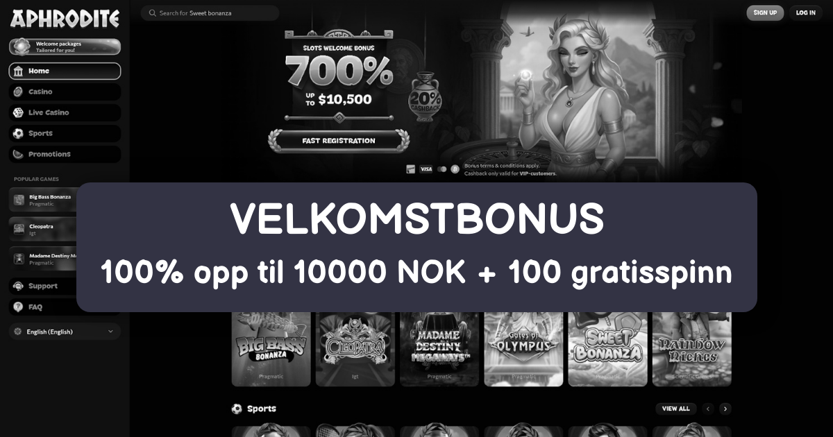 Aphrodite Casino markedsfører en stor pakke: 700% opptil €7000 fordelt over 5 innskudd. Minimumsinnskudd typisk €20. I praksis kan dette gi mye ekstra bankroll i starten. I tillegg forekommer ukentlige reloads og et VIP-program med cashback og prioritetssupport. Free spins kan være del av kampanjer, men detaljene varierer – sjekk kampanjesiden før aktivering.